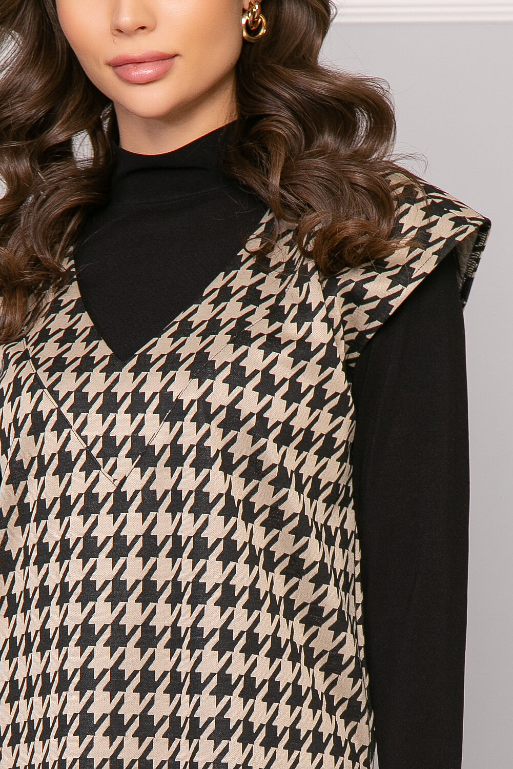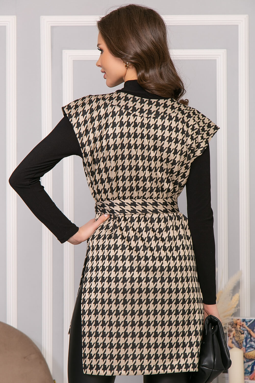 Удлинённый жилет с классическим принтом "Гусиная лапка" - абсолютно универсальная вещь. С ним можно надеть брюки любого кроя, джинсы, шорты, юбки и платья, водолазки, рубашки. С его помощью визуально вытягивается силуэт, придавая фигуре утонченность. В комплект входит пояс из основной ткани с металлической пряжкой-полукольцами. По бокам есть разрезы. Спинка удлинена.