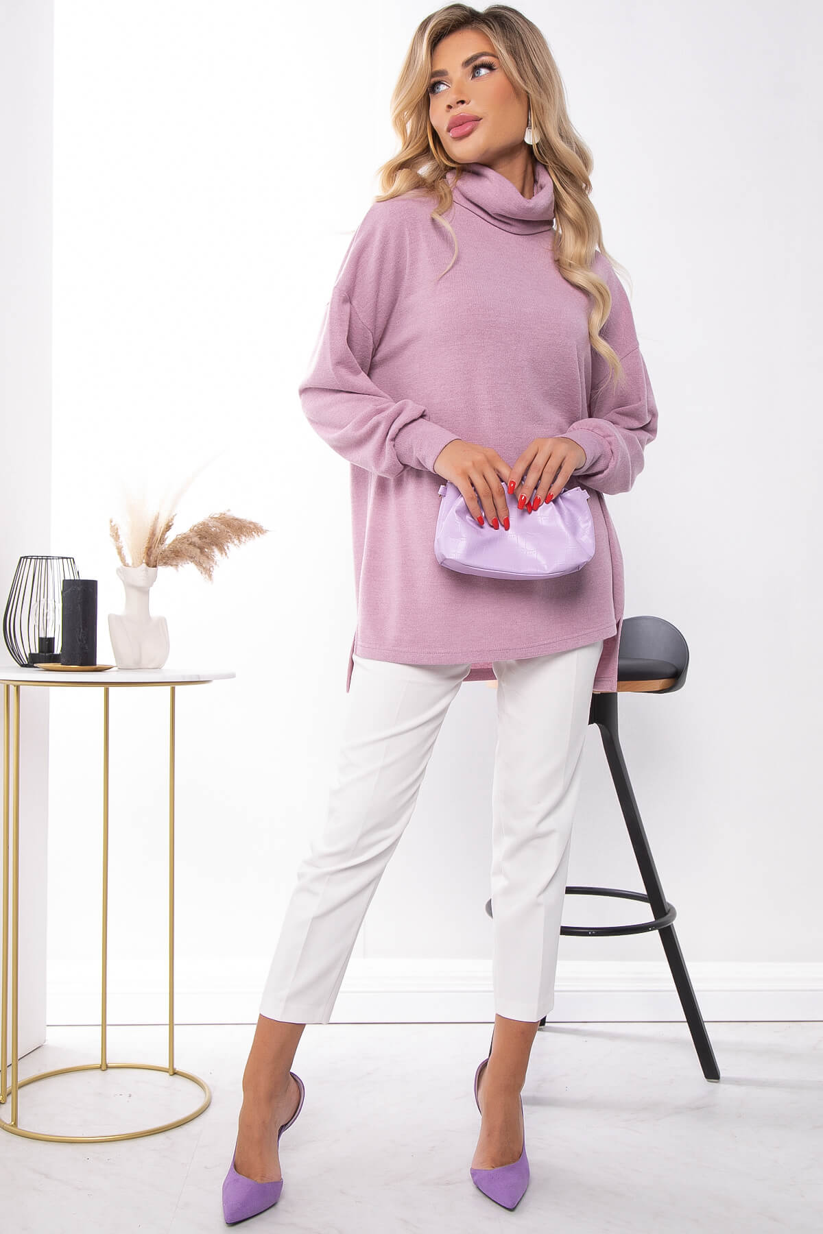 Горловина оформлена воротником "Хомут". По бокам джемпера есть разрезы.