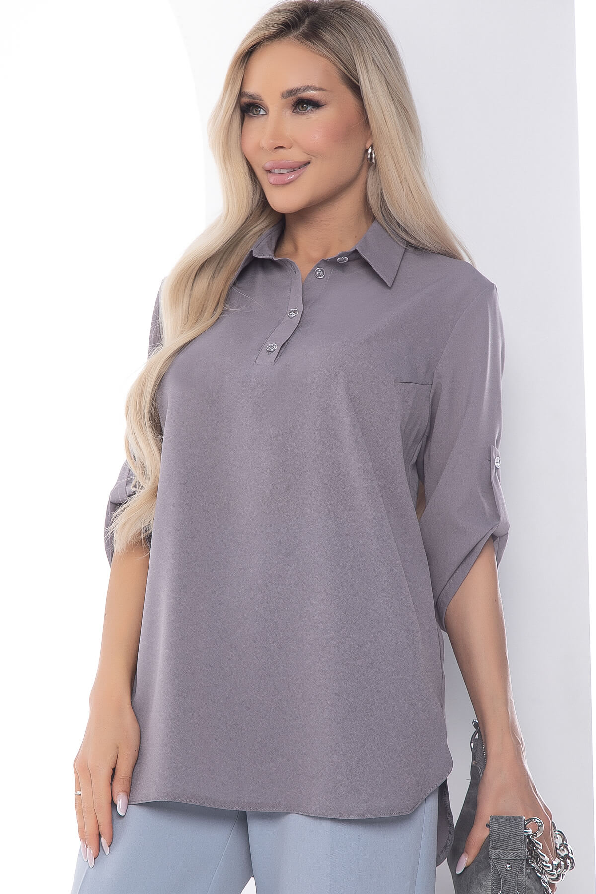 Лёгкая блуза свободного кроя в сером оттенке! Блуза с удлиненной спинкой, края скруглены, по бокам разрезы. Классический отложной воротник, по переду застёгивается на 4 пуговицы. Рукав три четверти, на пате. По спинке есть акцентная деталь - кокетка. Такая блуза подойдёт для создания офисного образа, а также её можно использовать в повседневных ансамблях.