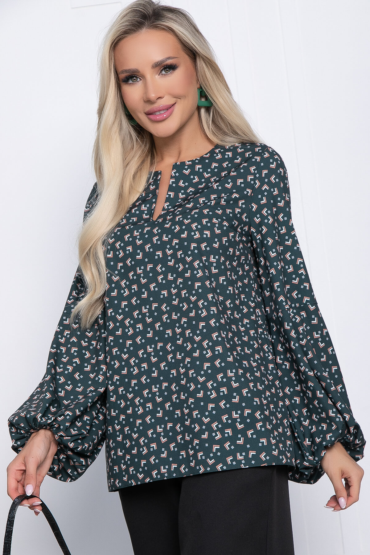Блузка с геометрическим принтом - прекрасный выбор для стильных офисных образов! Отлично сочетается с юбками и брюками. Свободный крой позволяет с лёгкостью скрыть недостатки фигуры. Низ рукавов на резинке.