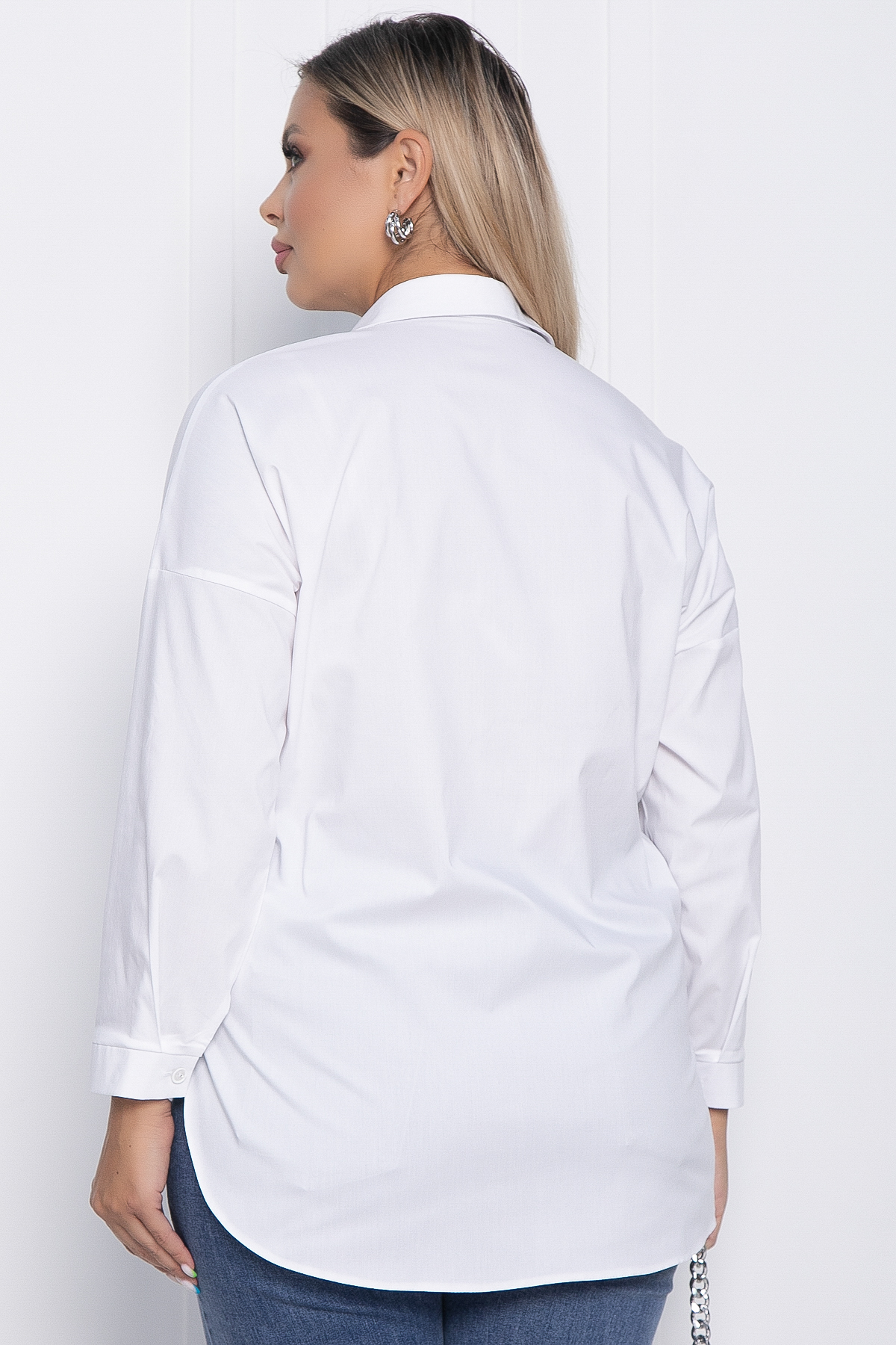 Рубашка прямого кроя со спущенным плечом создаёт расслабленный, но элегантный образ. Её классический дизайн с пуговицами позволяет носить её в любой ситуации. Рукав полной длины заканчивается манжетом и застёгивается на пуговицу. Рубашка удлиненная сзади, а форма низа округлая, что придаёт ей модный и стильный вид. Воротник выполнен в форме классической рубашки.