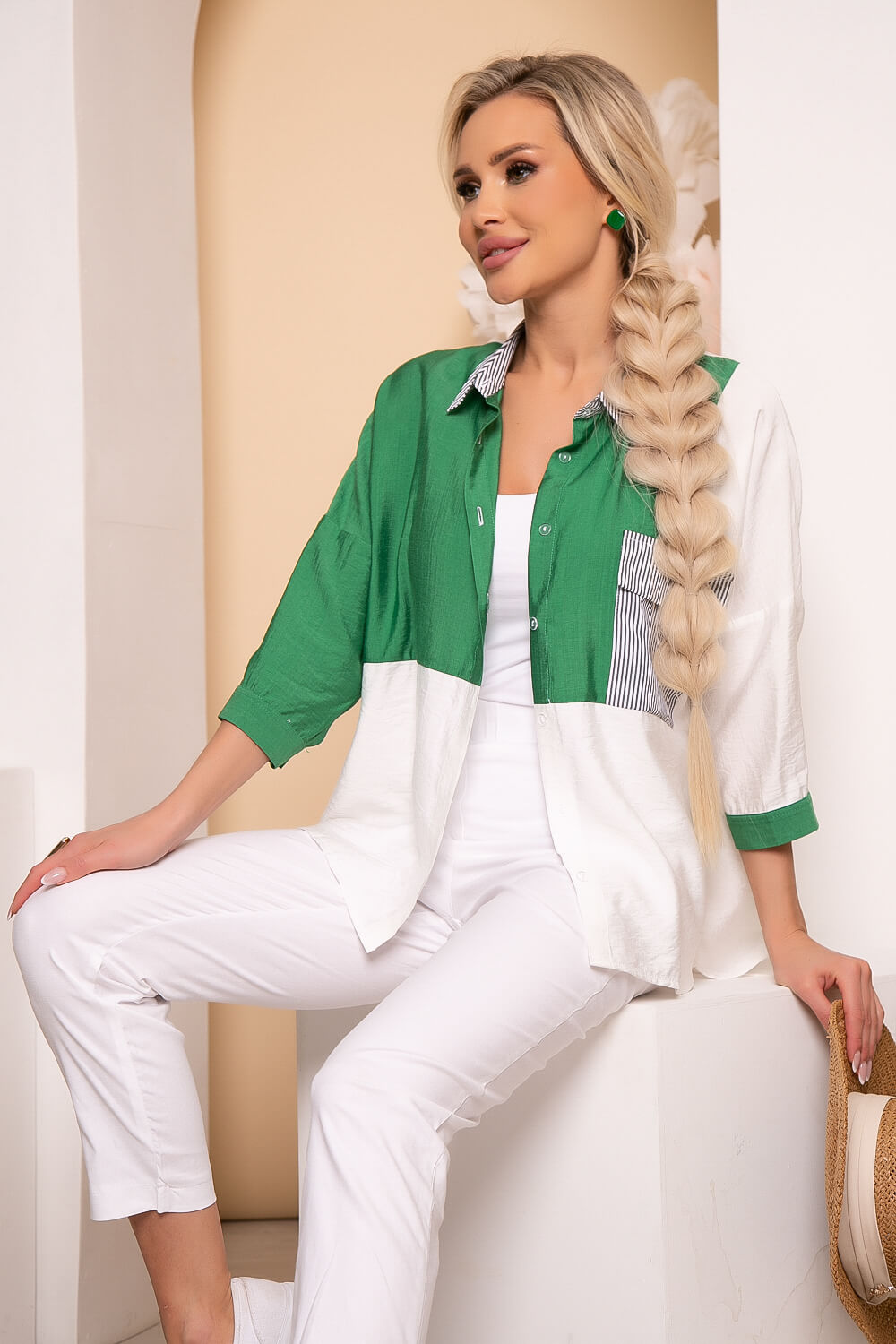 Рубашка из вискозы - идеальный вариант для летнего гардероба. Идеально будет сочетаться с джинсами, брюками или юбками. Рубашка со спущенным плечевым швом, рукав семь восьмых, по переду застёгивается на пуговицы. Спинка удлинена. Рубашечный воротничок, на груди есть функциональный кармашек.