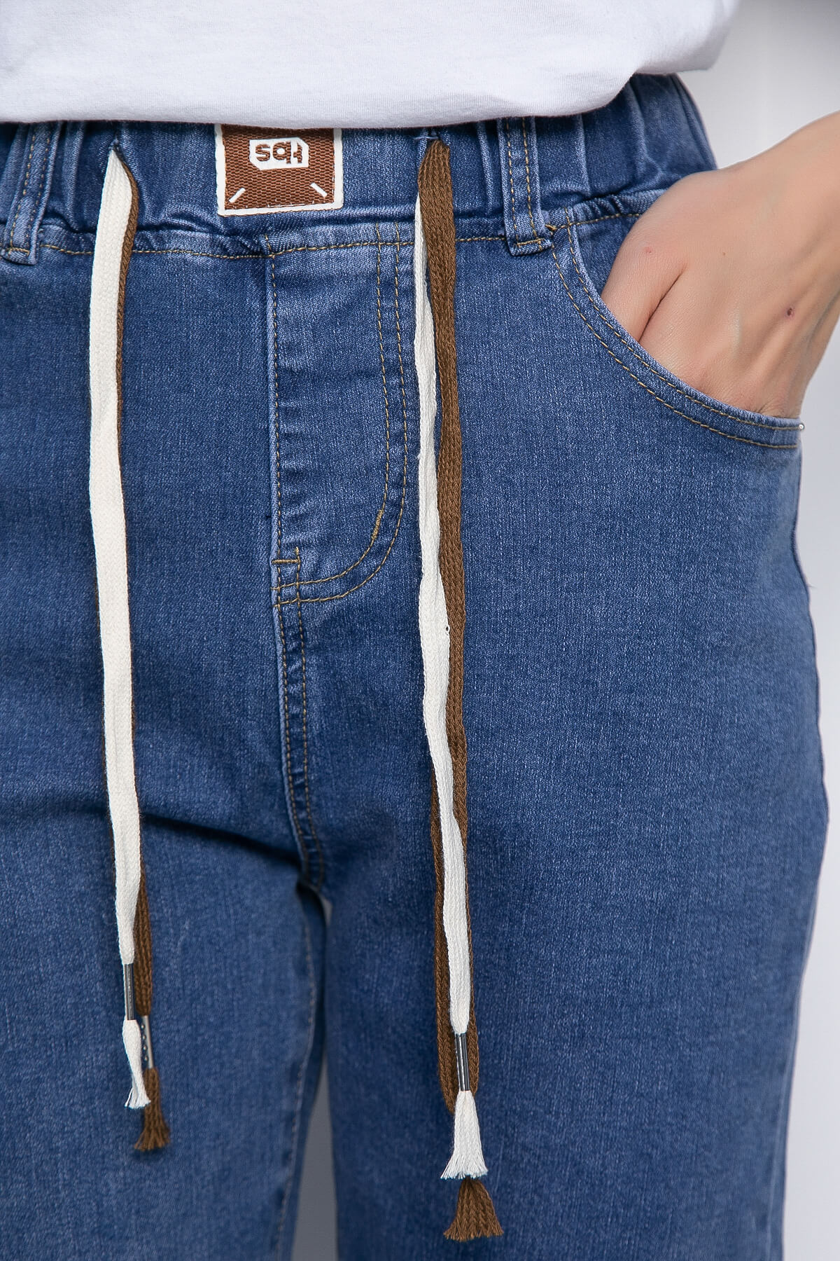 Прямые синие джинсы сочетаются практически с любыми «верхами»: рубашками, футболками, джемперами, худи, пиджаками. Есть карманы в боковых швах и на задней части изделия. Талия на резинке, дополнена акцентной шнуровкой.