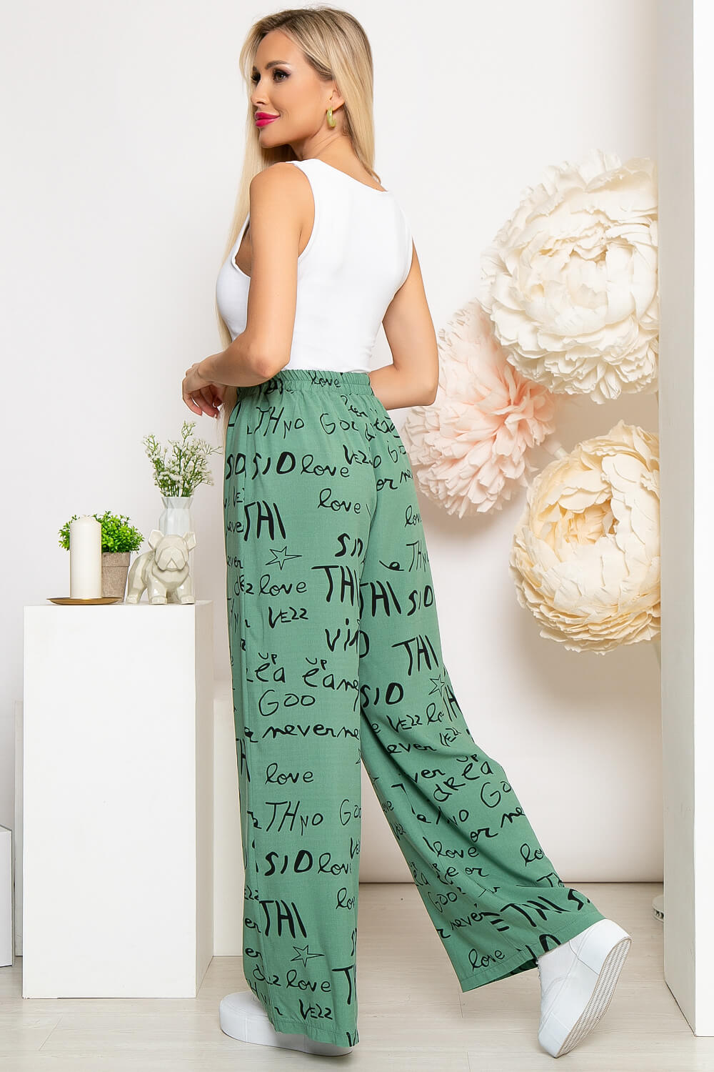 Брюки палаццо из штапеля - настоящая находка для летних образов. Широкий крой и невесомая ткань позволят чувствовать себя максимально комфортно. Чтобы сделать образ нарядным, наденьте туфли на каблуке и приталенный верх, а для расслабленного образа - кеды и футболку. Брюки свободного кроя, талия на резинке, есть карманы.