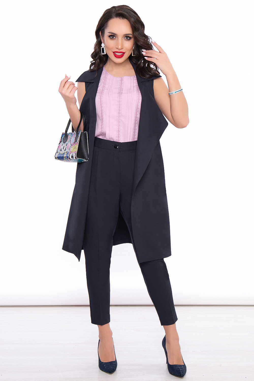 Брючные костюмы называют основой базового гардероба каждой модницы. Костюмы легко комбинируются с другими вещами, создавая образ, подходящий к любому случаю! Универсальный жилет полуприлегающего силуэта без рукава с дизайнерским отложным воротом. Брюки укороченные на притачном поясе, боковых швах карманы. Жилет без застёжек, фиксируется поясом с металлической пряжкой.