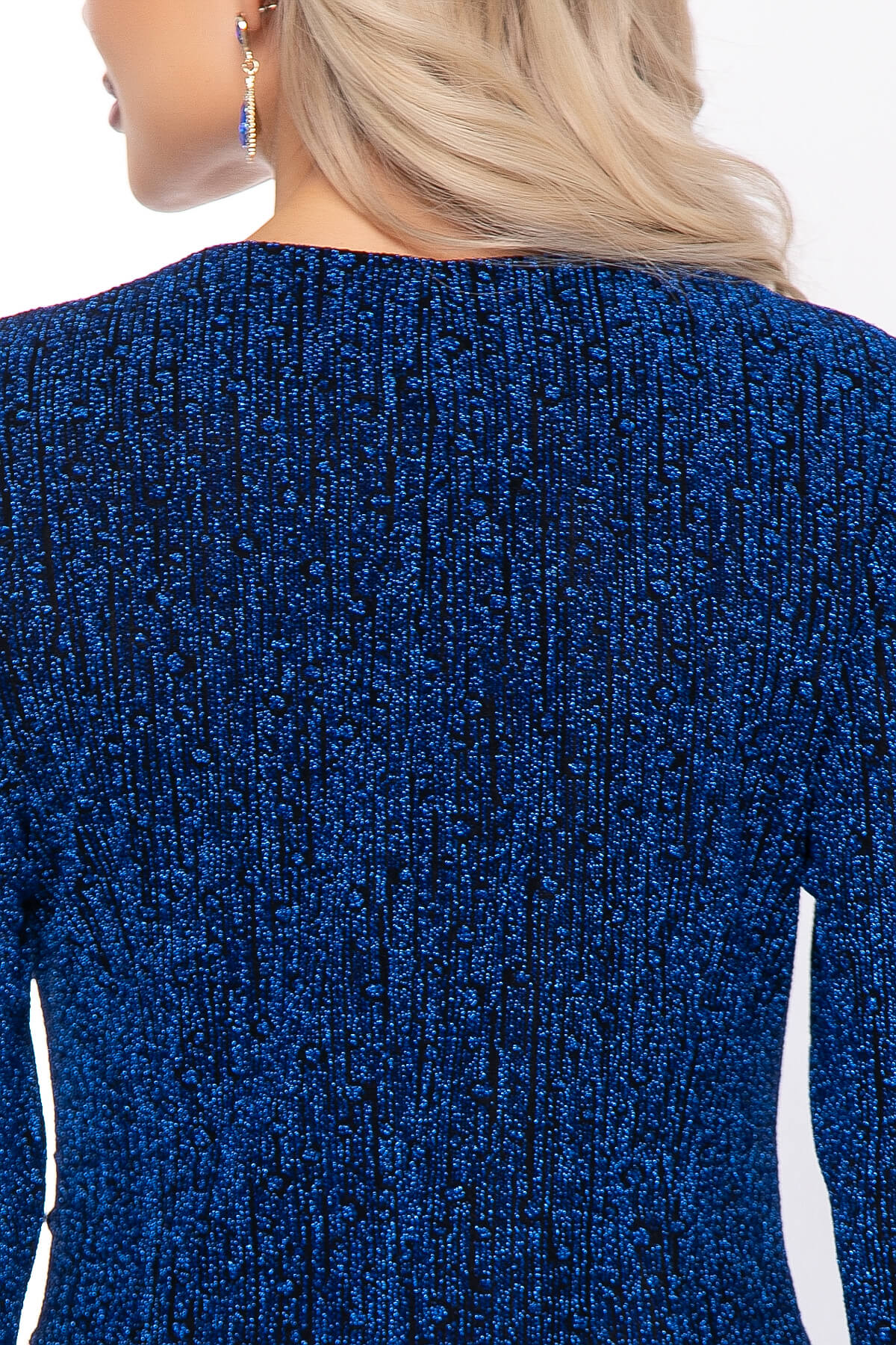 Вечернее платье прилегающего силуэта в мерцающем синем оттенке. Эффектное платье с V-образным вырезом. Перед скроен по принципу платья с запахом со сборкой в области талии. По низу изделие скруглено, что визуально удлиняет ножки. Шикарный вырез идеально подчеркивает зону декольте. Платье без подкладки.