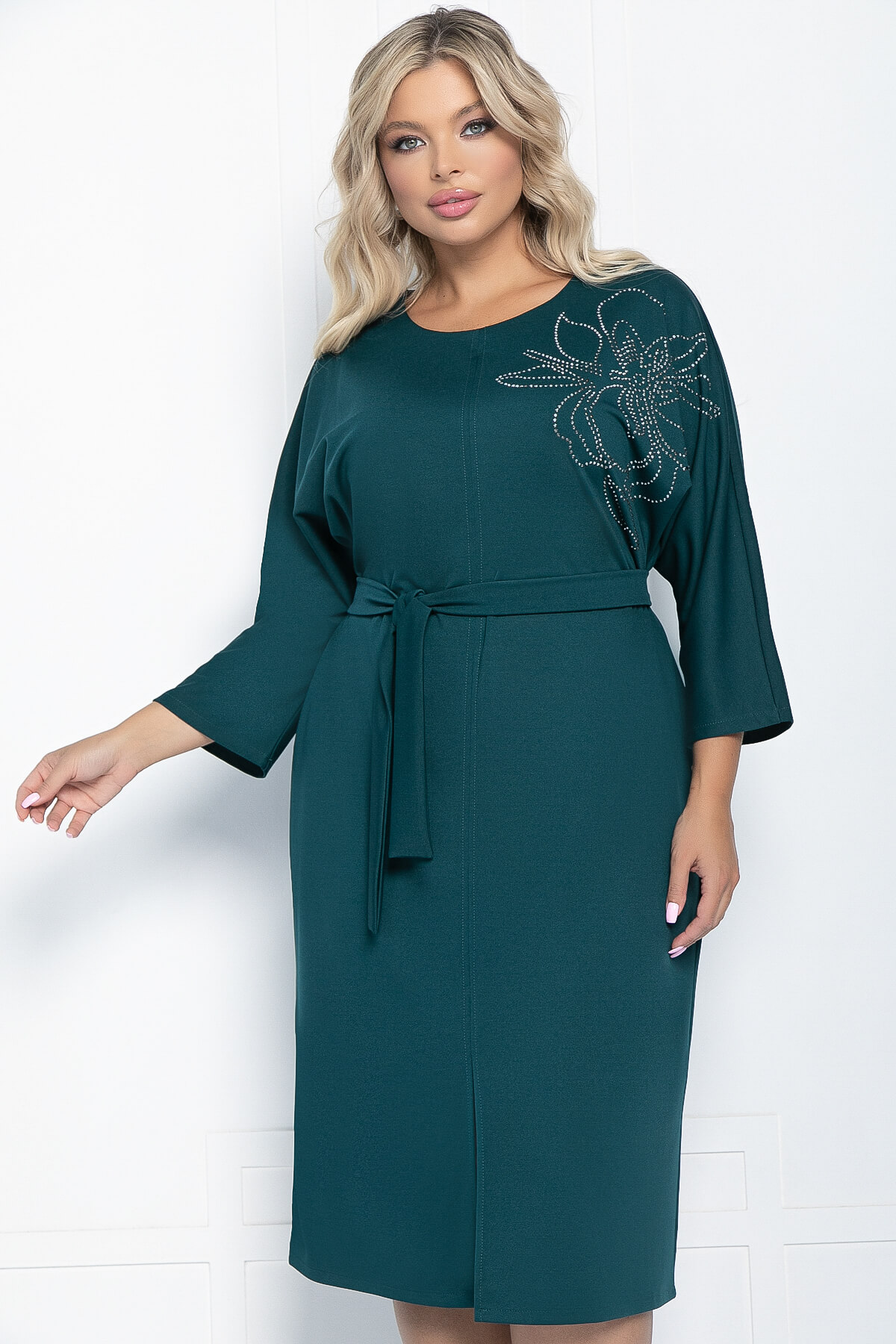 Платье из трикотажа, которое создано, чтобы подчеркнуть вашу женственность и создать легкий и воздушный образ. Элегантность и комфорт в одном флаконе! Изделие полуприлегающего силуэта с игривым разрезом по переду. Рукав широкий, скроенный по типу "летучая мышь". Изделие украшает флористический принт из страз. В комплект входить пояс из основной ткани, который идеально подчеркивает преимущества фигуры.