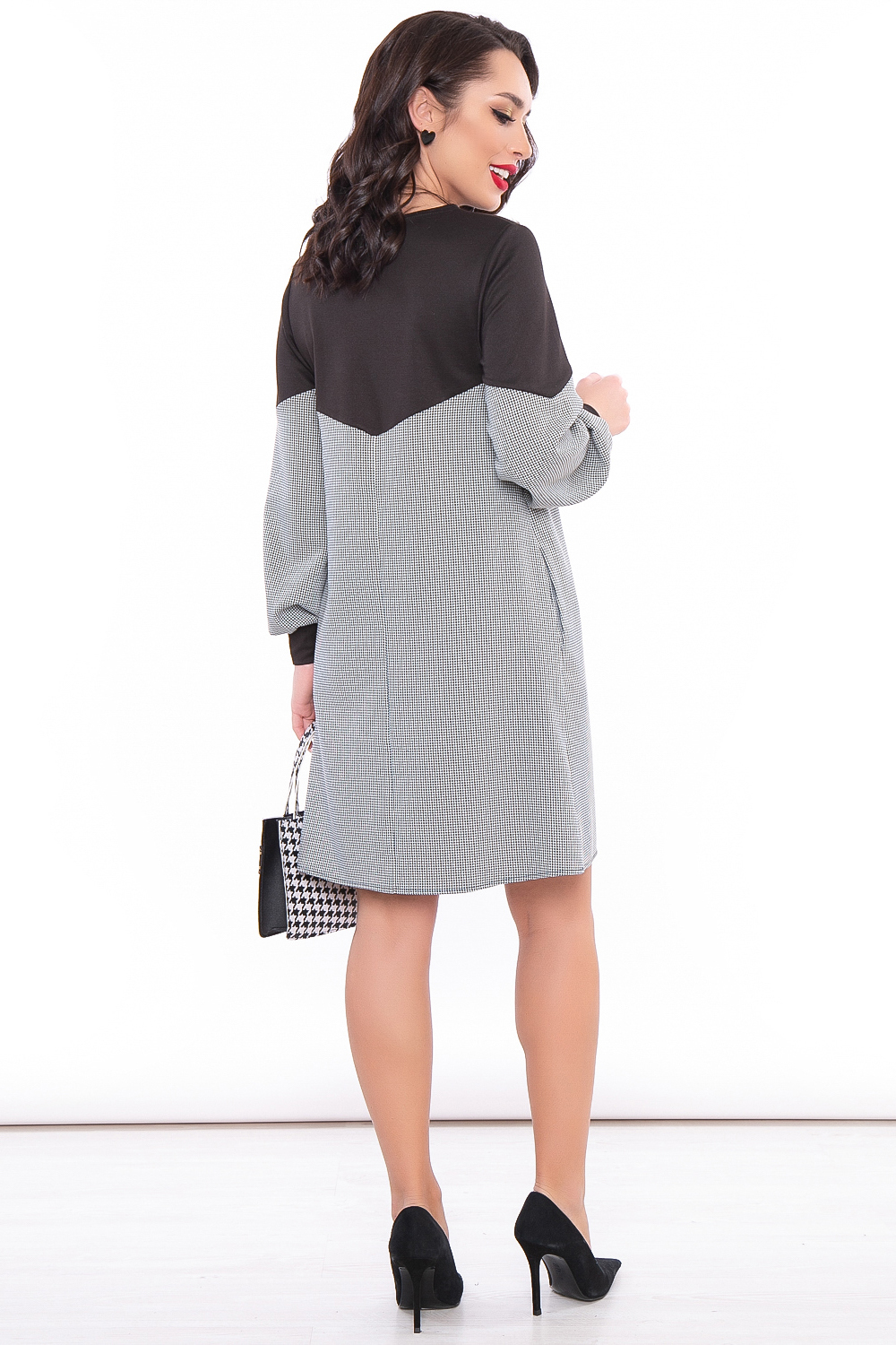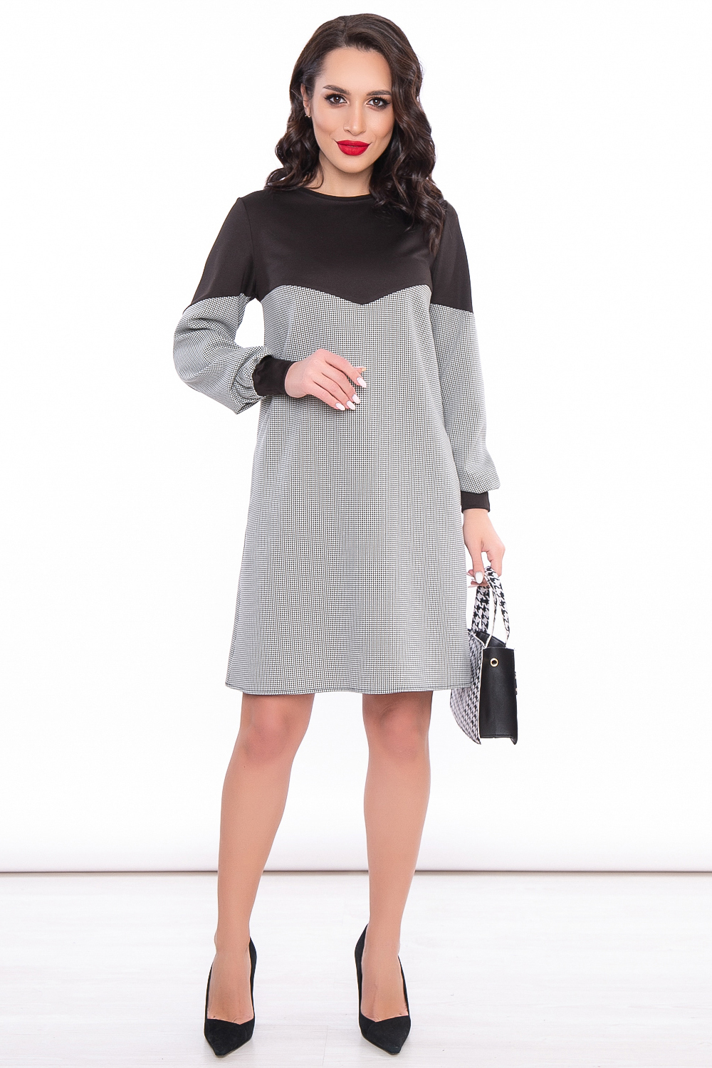 Платье в клетку с контрастным верхом А-силуэта. Рукав втачной, длинный, на манжете. Мягкий округлый вырез горловины. Верхняя часть платья выполнена из чёрной, контрастной ткани, что, безусловно, добавляет платью в клетку оригинальность!
