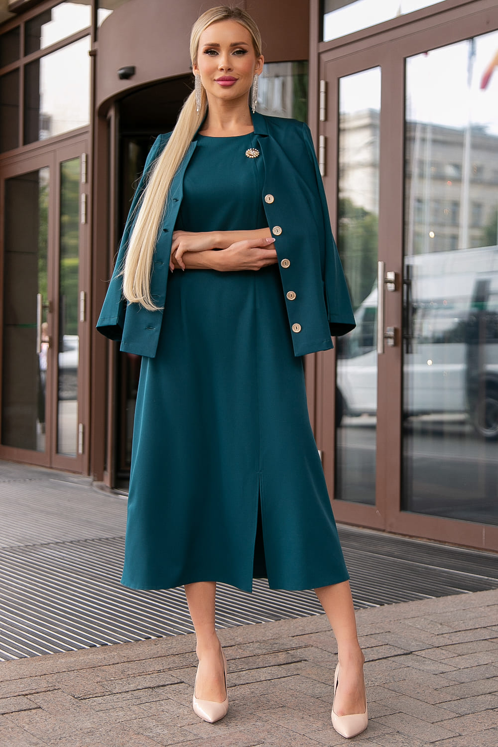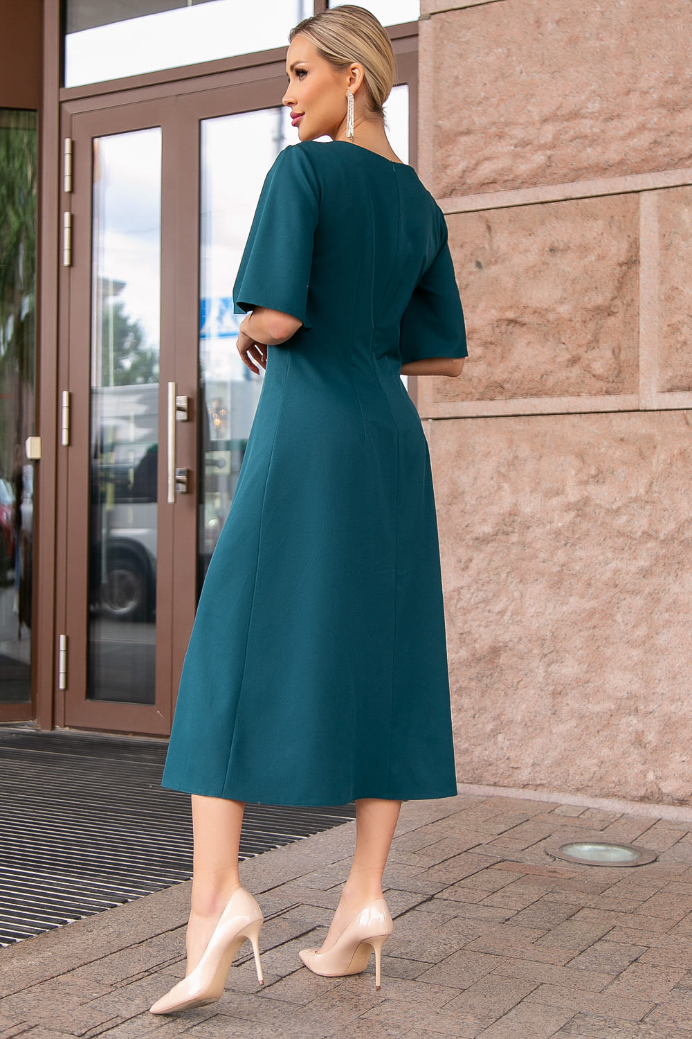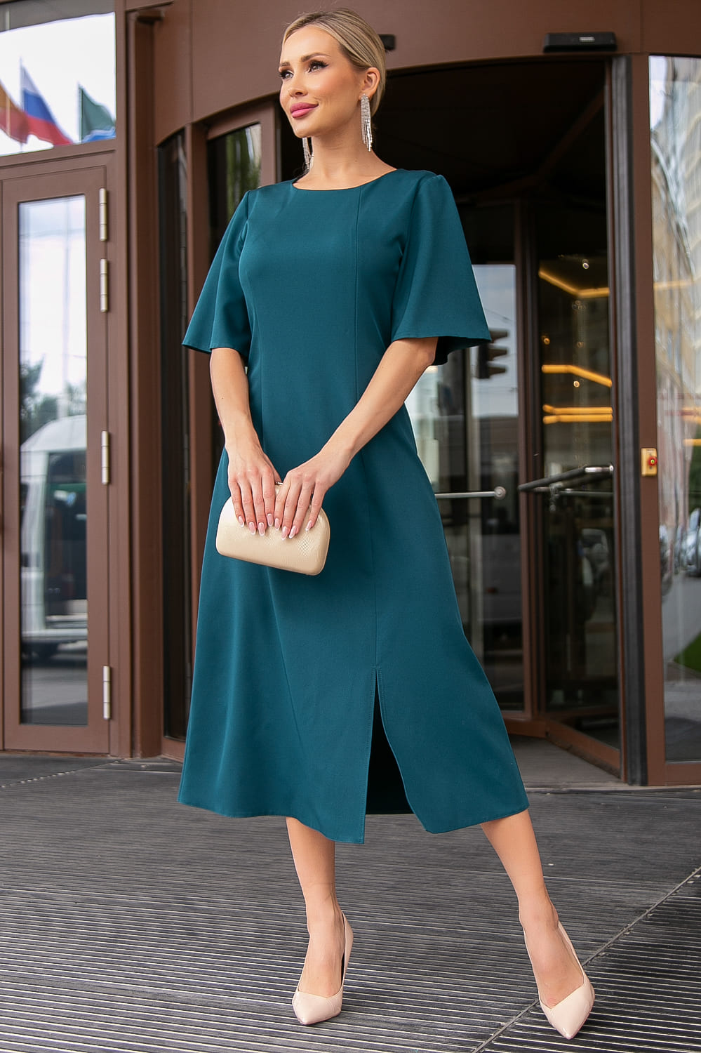 Элегантное платье длины миди станет украшением деловых образов. Стоит обратить внимание на его женственный и лаконичный дизайн, благодаря которому платье может легко стать украшением вечернего образа, достаточно лишь подобрать соответствующие аксессуары. Платье полуприлегающего кроя. Акцент на передней части платья - разрез по ножке. Рукав втачной, укороченный, кроя "колокольчик". По спинке застёгивается на потайную молнию. Платье без подкладки.