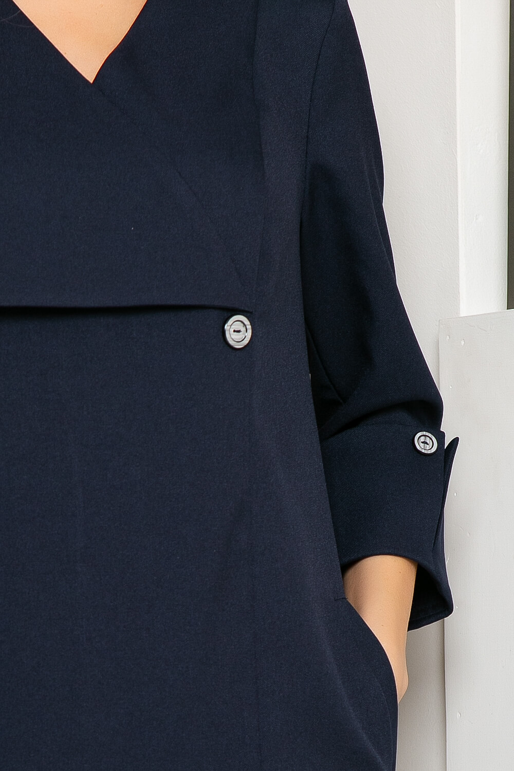 Платье в деловом стиле с оригинальным дизайном. Верх платья скроен с имитацией запаха и ассиметричным отложным воротником. По низу юбки выполнен декоративный элемент, перекликающийся с верхней частью платья. Втачной рукав, три четверти с широким отворотом. В комплект входит пояс с пряжкой.