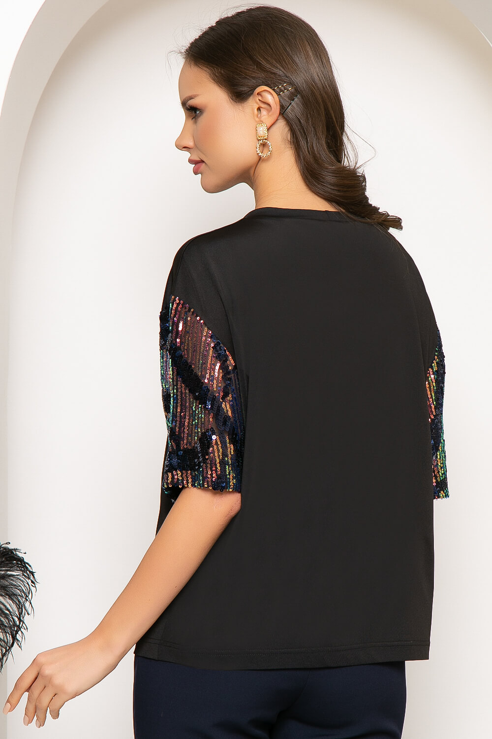 Модные образы с футболкой давно перестали ассоциироваться исключительно с повседневным спортивным стилем. Представляем вашему вниманию футболку, созданную, чтобы стать акцентом вашего вечернего облика. С её помощью вы сможете создать удобный, но при этом модный и красивый образ. Футболка свободного кроя, линия плеча спущена. Рукав выполнен из ткани с пайетками.