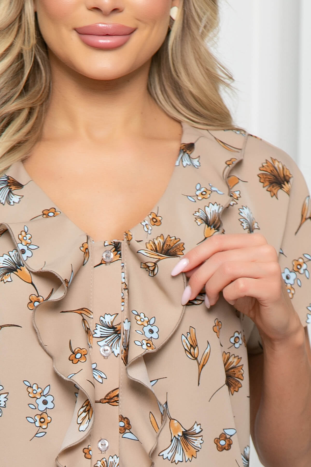 Классическая блуза прямого кроя из шелковистой ткани с цветочным принтом. Такая модель гармонично впишется в деловой гардероб. Блуза по переду оформлена рюшей, что делает образ лёгким, воздушным. По бокам для удобства есть небольшие разрезы.