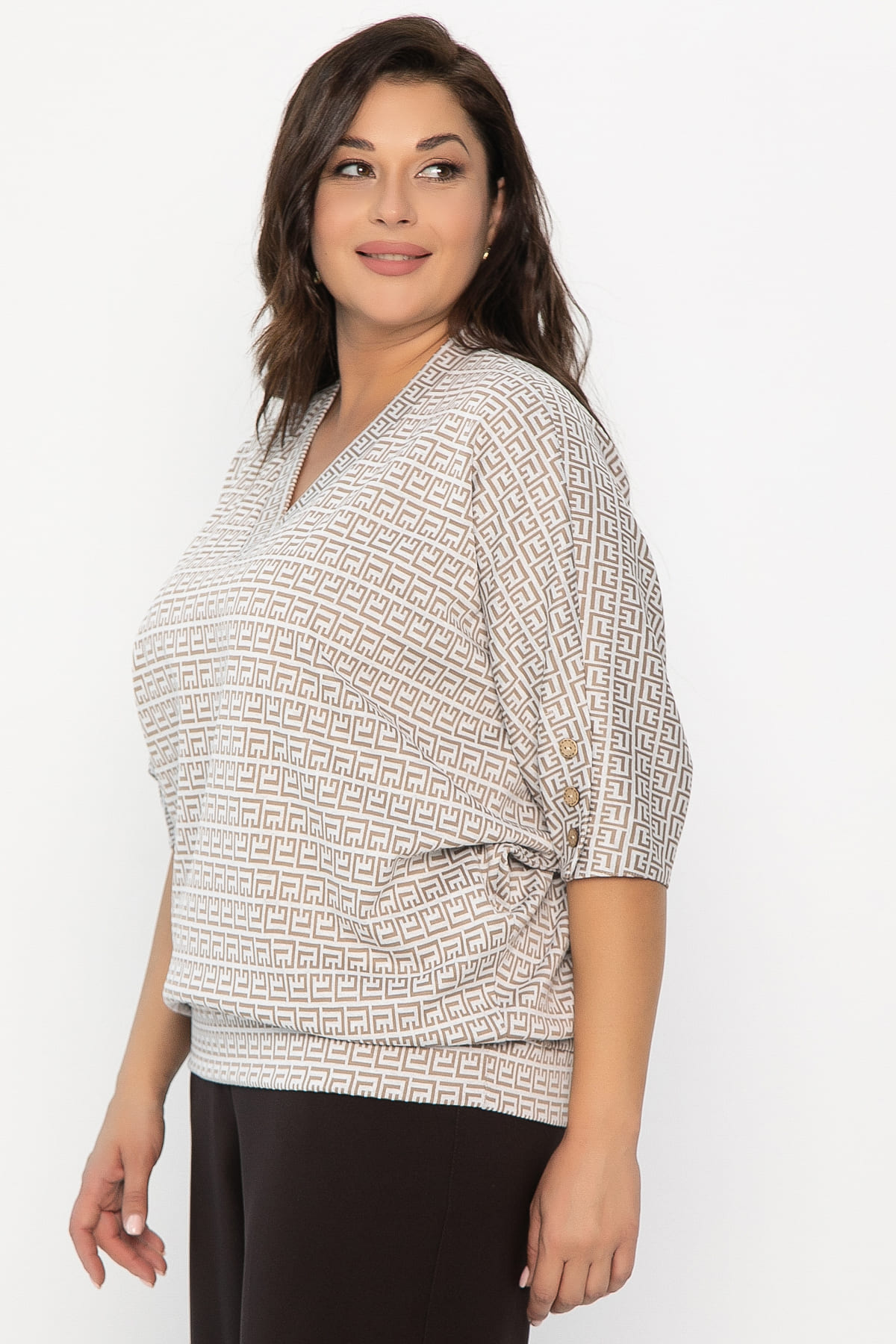 Этот уютный трикотажный джемпер с рукавами летучая мышь — идеальное сочетание комфорта и стиля. Благодаря свободному крою и мягкому материалу он создает ощущение легкости и свободы движений, а V-образный вырез добавляет нотку элегантности и женственности. Идеальный выбор для прохладных дней, когда хочется выглядеть стильно и чувствовать себя уютно в любой ситуации. Рукава цельновыкроенные, украшенные тремя пуговицами с каждой стороны. Есть притачной пояс по низу изделия.