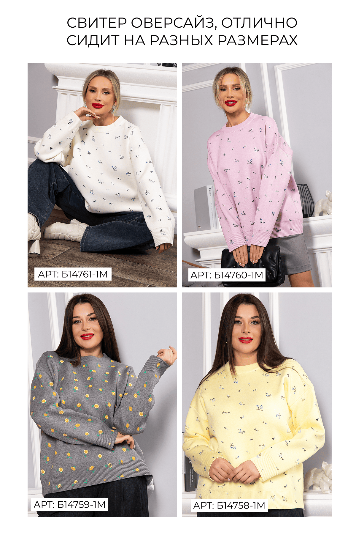 Вязаный женский свитер с цветочным принтом — отличное дополнение к вашему гардеробу. Модель изготовлена из невероятно мягкого трикотажного материала. Свободный крой не ограничивает движения и придает стильный силуэт. Этот цвет прекрасно сочетается с большинством базовых вещей: будь то классические джинсы, комфортные брюки или любимые юбки и шорты. Цветочный принт добавляет образу утонченности и легкости, превращая обычный свитер в яркий акцент. Такой свитер станет незаменимым спутником в учебе, на работе, встречах с друзьями, прогулках на свежем воздухе и дома. Он позволяет создавать разнообразные образы, обеспечивая тепло и свободу движений каждый день. Сделайте свою жизнь уютнее и свежее с нашим новым свитшотом!