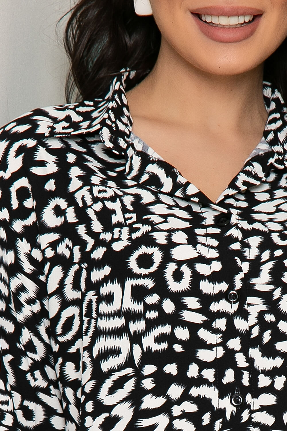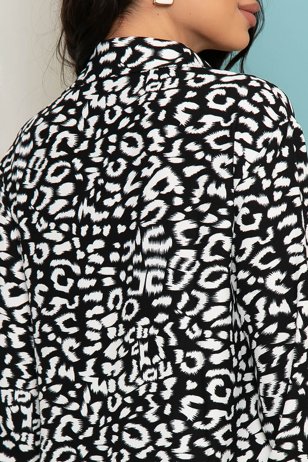 Женские блузки всегда были и будут в моде. Предлагаем Вам вариант стильной блузы с анималистичным принтом для стильных образов весна-лето 2022. Блуза свободного кроя с удлиненной спинкой. Рукав втачной, длинный, низ на манжете. Классический отложной воротничок, по переду притачная планка, блуза застёгивается на пуговицы. По бокам полочки скруглены. Не забывайте, что правильно собранный образ позволит блистать и быть невероятно элегантной и роскошной леди в любой ситуации.