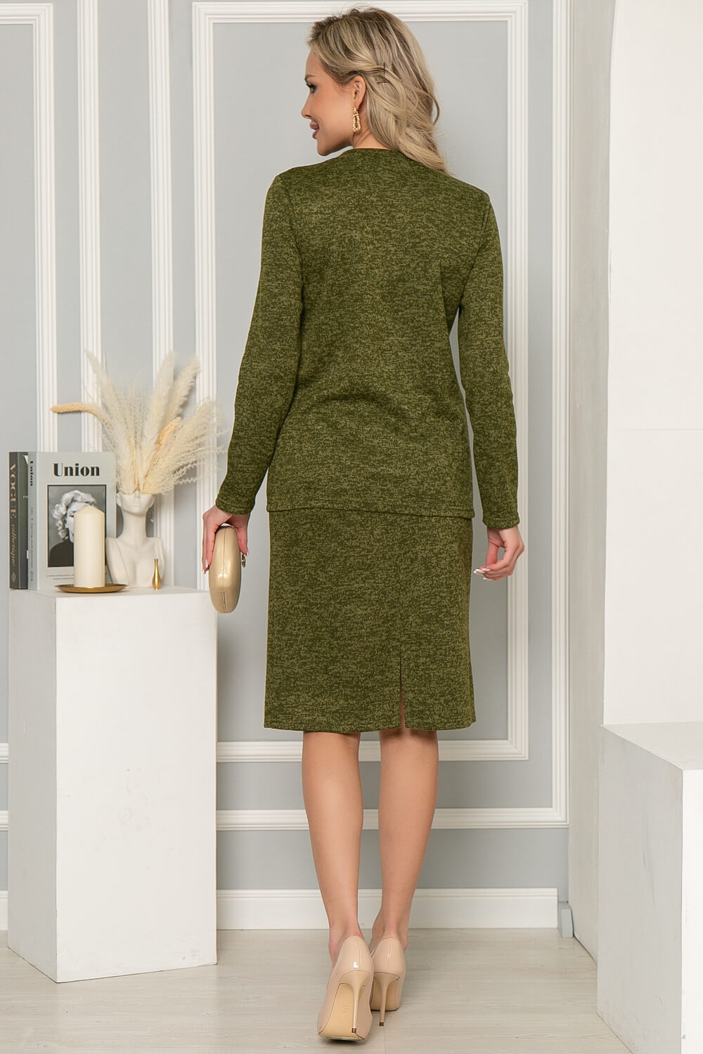 Костюм-двойка, состоящий из юбки на резинке и джемпера прямого кроя. Очень удобный комплект для создания стильного повседневного или делового образа. При желании подчеркнуть талию, верх можно заправить. Удлиненный джемпер прямого кроя имеет округлый вырез горловины и длинный рукав. Юбка прямого кроя, по талии на комфортной резинке, сзади есть разрез. Юбка без подкладки. По горловине джемпер украшен пришивными жемчужными бусинами.