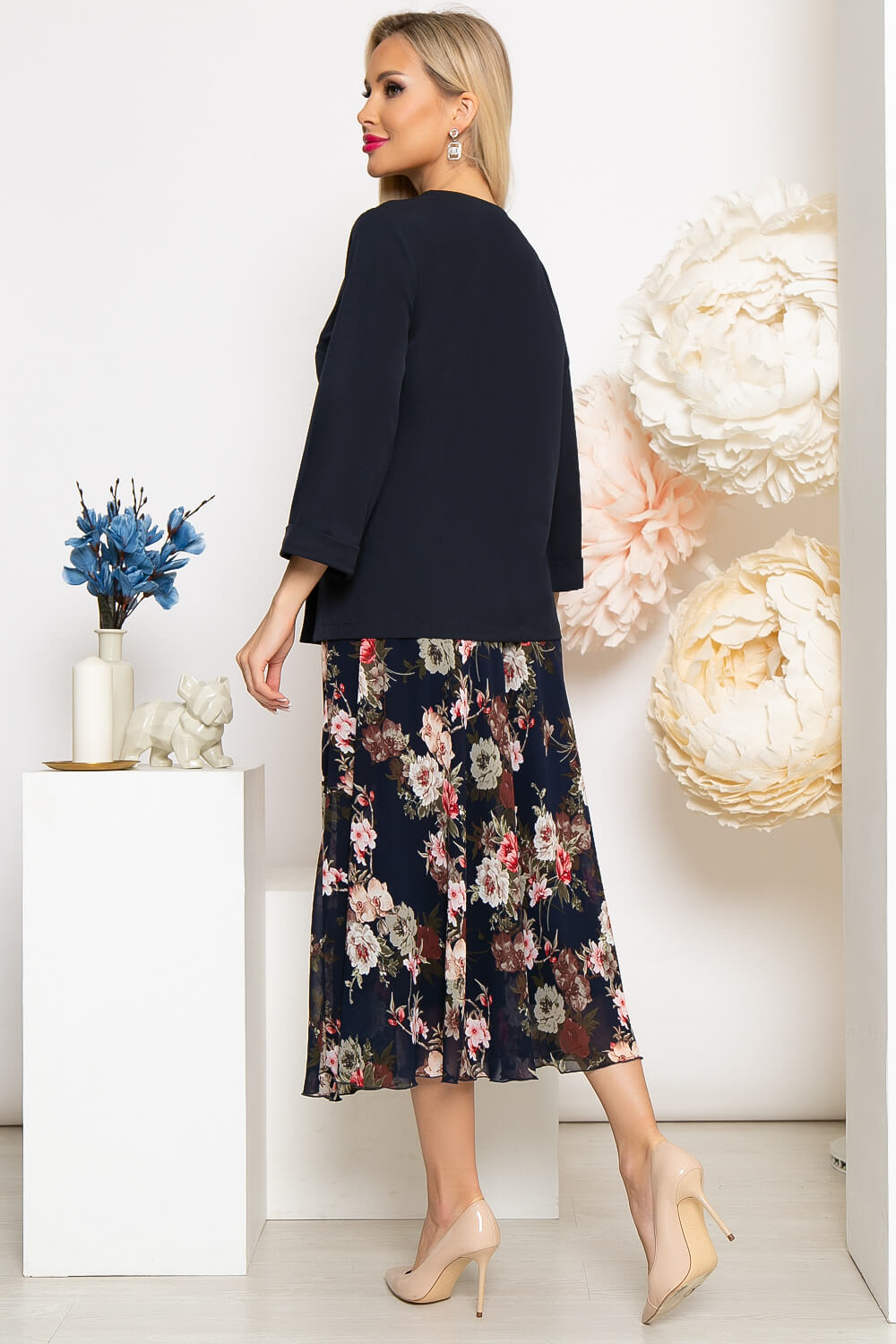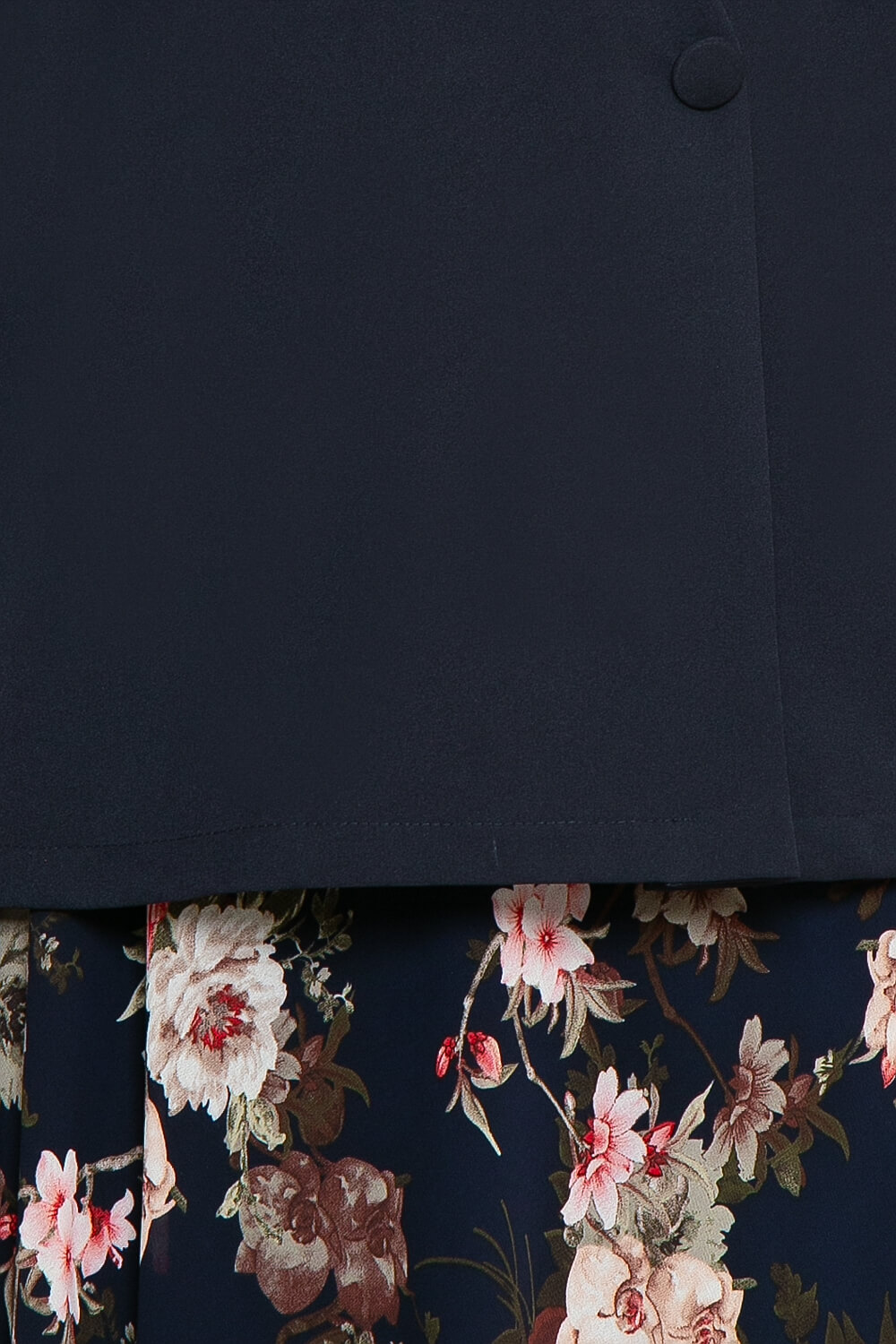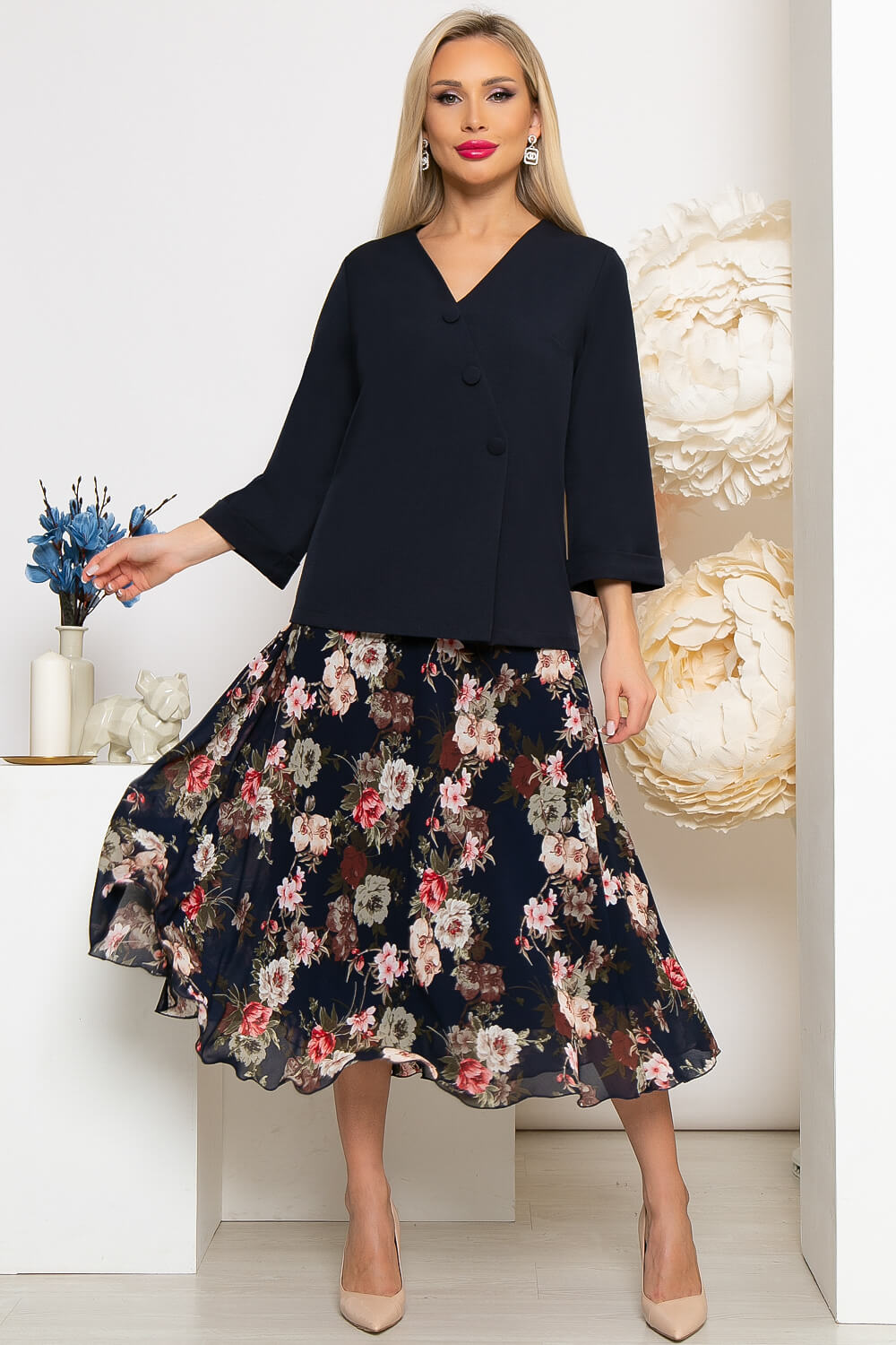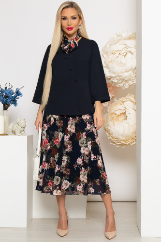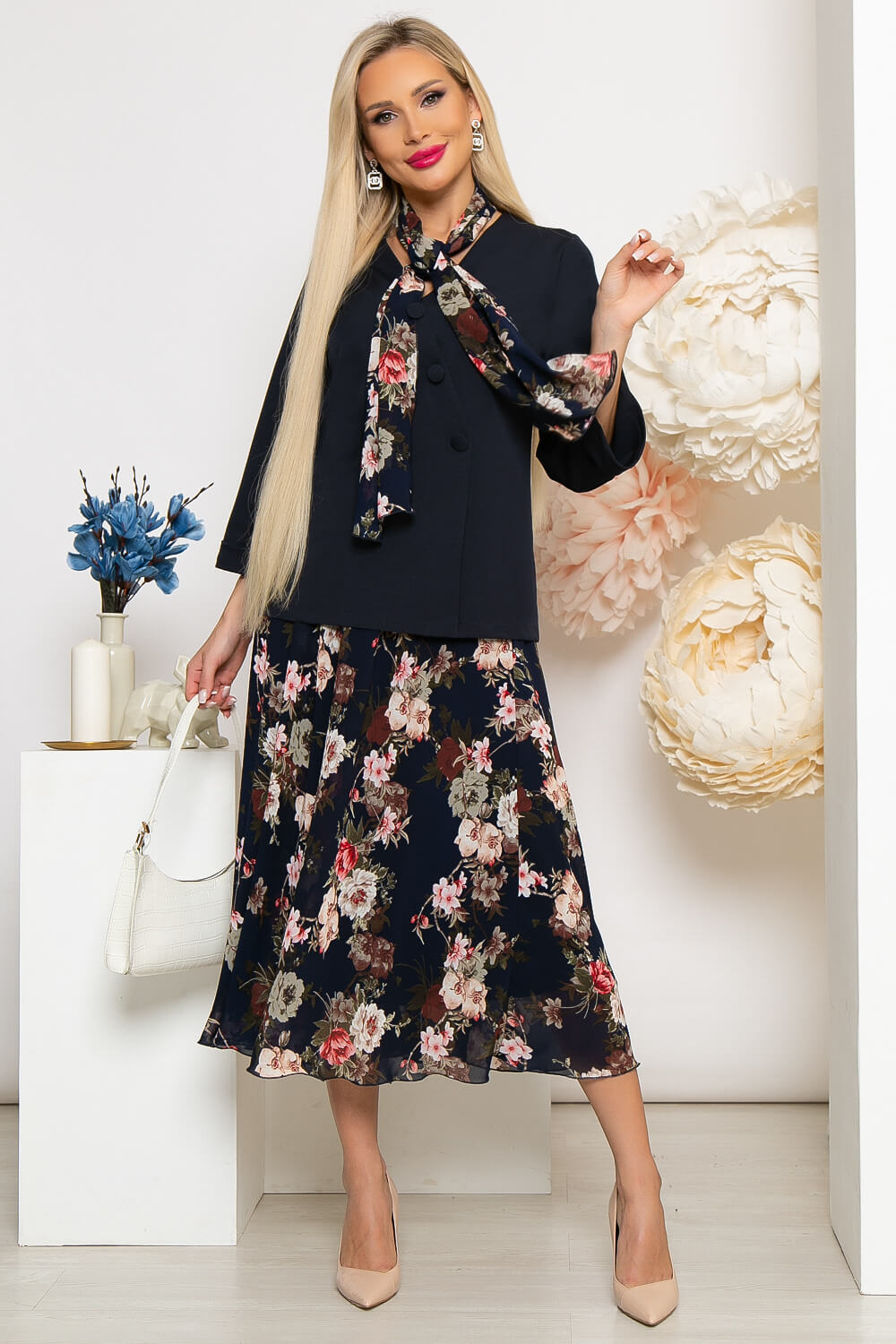 Элегантный костюм в глубоком синем оттенке. В любом образе главное - это правильно расставленные акценты. Мы позаботились о том, чтобы Ваш образ выглядел безупречно и добавили к костюму элегантный аксессуар - шифоновый шарфик, который вы можете повязать любым понравившимся способом: классический вариант - на шею, как платок или галстук, а также можно повязать на сумку или оформить им причёску. Летящая шифоновая юбка подарит лёгкость походке, а цветочный принт добавит женственности образу. Жакет из костюмной ткани свободного кроя с имитацией застёжки по переду оснащён V-образным вырезом головины.
