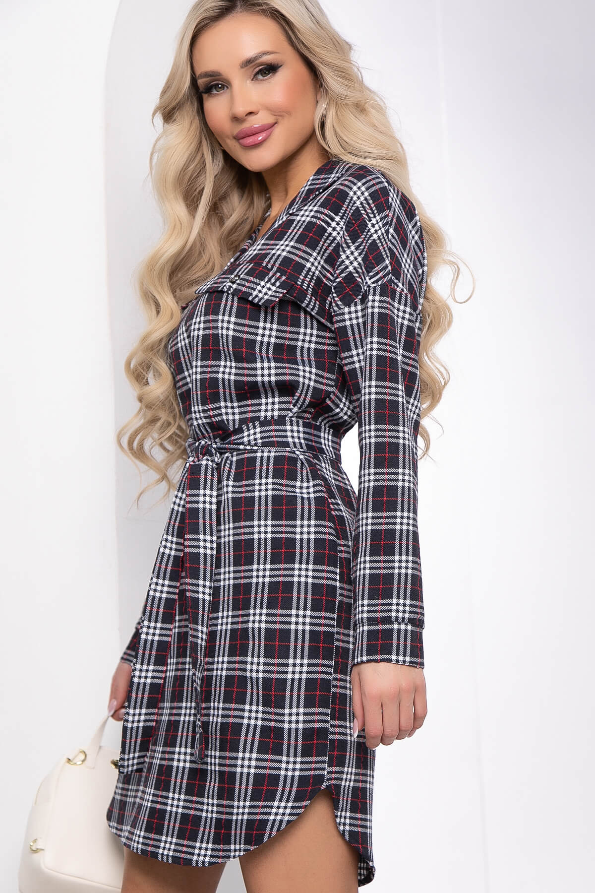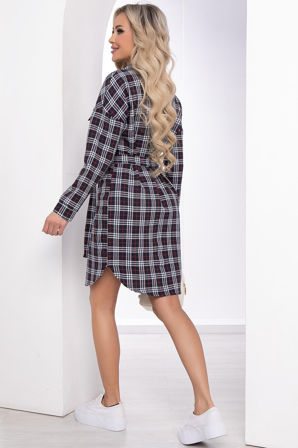 Стильное и комфортное платье - рубашка в клетку на каждый день. Модель можно носить с поясом из основной ткани. Отложной воротничок, рукав длинный со спущенным плечевым швом, на манжете. На груди имитация карманов. В таком свободном платье в клетку удобно гулять с ребенком или просто проводить активный отдых с друзьями.